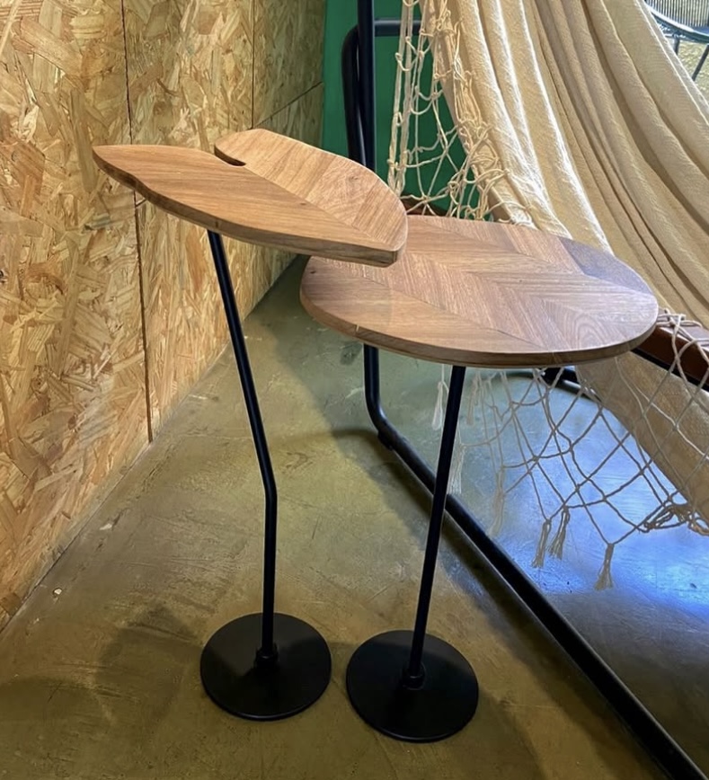 Mesas laterais com design autoral, composto por uma mesa com tampo em formato de folha e outra com tampo em formato orgânico. A base da peça é feita em aço carbono, o tampo em marchetaria com madeira maciça freijó e mdf.