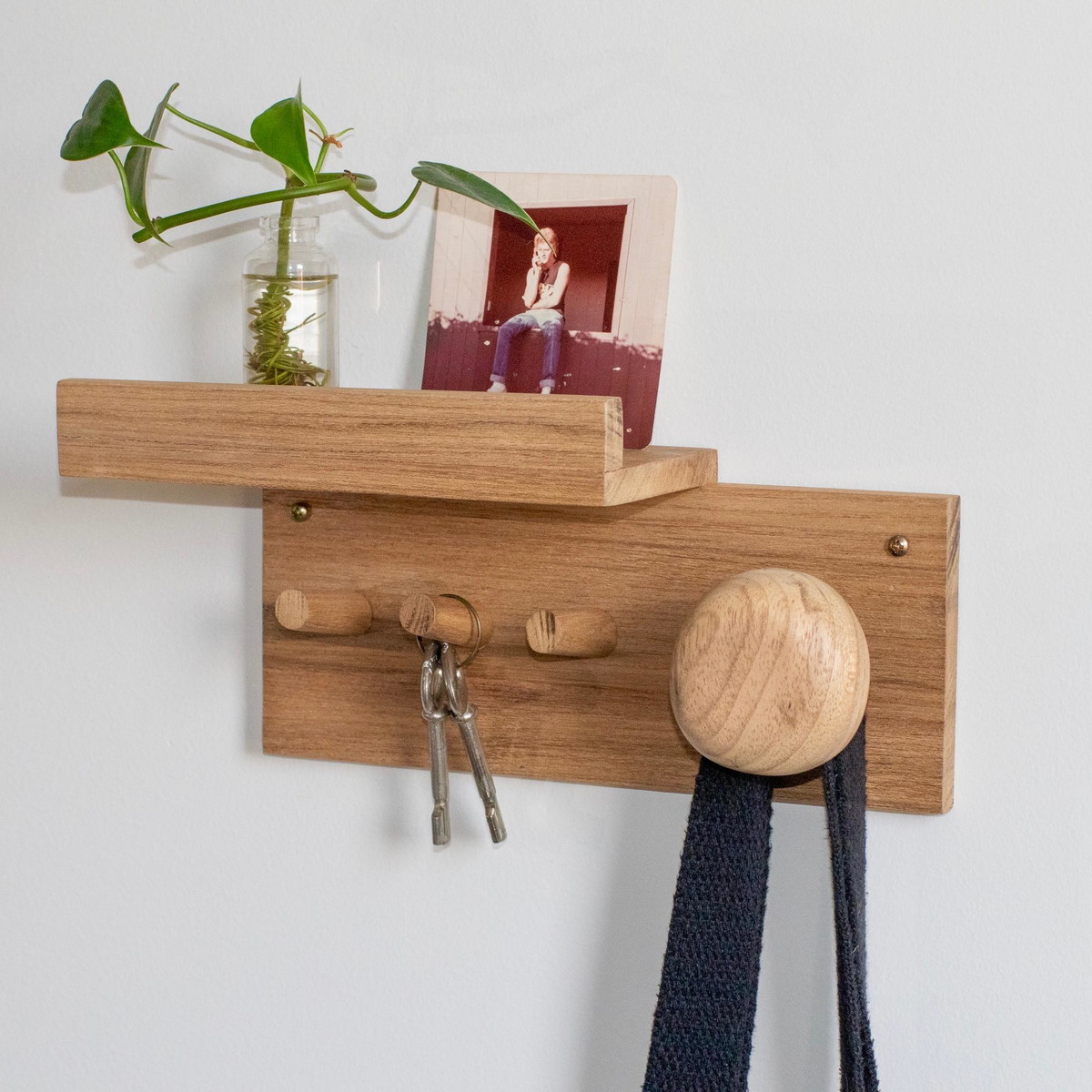 Em madeira maciça, além de porta chaves, possui também uma prateleira e um pendurador, ajudando a decorar e organizar o hall de entrada.